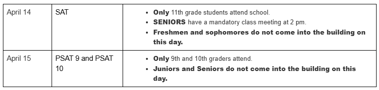Spring testing is THIS WEEK with SAT and PSAT exams for grades 9-11. We will not follow our normal school schedule this Tuesday or Wednesday. State Testing will take place as follows: |