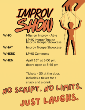 Save the date! Mission Improv-Able, our Improv Troupe, will host a showcase performance on April 16 at 6 pm. Tickets are available at the door for $5, which will include a drink coupon and a snack coupon. Come join us for a fun-filled forty-five minutes.