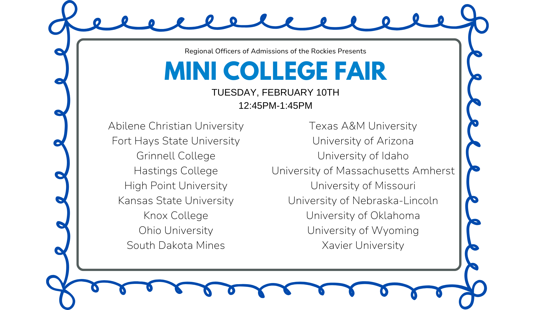 Our Mini College Fair will take place next Tuesday, February 10th, from 12:45 to 1:45 in the Commons. This event is offered by ROAR (Regional Office of Admissions of the Rockies) and will include colleges from out of state. This is a regular school day, and colleges will have tables in the commons. Students can attend during 2nd lunch, or students in grades 10th-12th can ask their teacher for a pass. See the list above of colleges attending. |