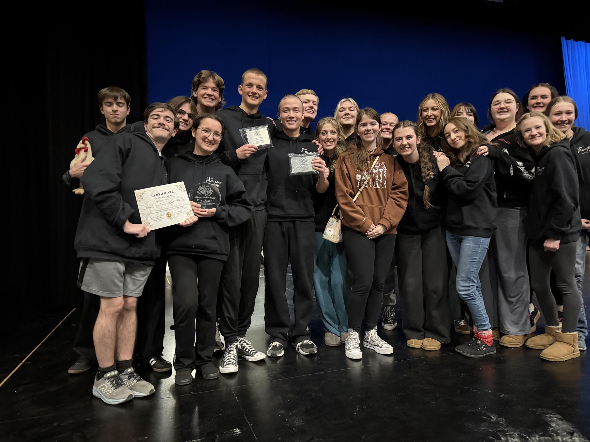 *** LP Theater students attended the Pikes Peak Region Invitational One Act Competition and performed incredibly! LP won titles for best supporting actor- Ben Egbert, and best actor- Jonathan Lilley. LPHS was the only school to win two awards. This year they ranked the shows, and LP Theater won 1st Place! Congratulations, LP students, and Mrs. Lilley! |